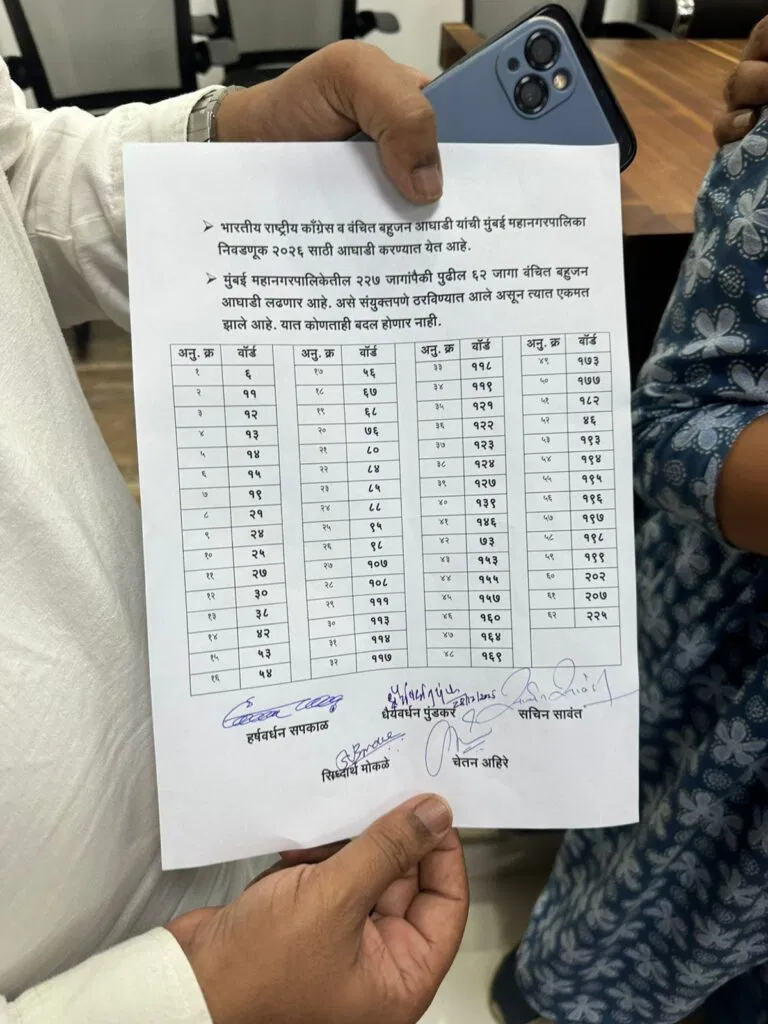 वंचित बहुजन आघाडीने नुकतीच एक प्रसिद्धीपत्रक जारी केले आहे. या अधिकृत दस्तऐवजानुसार, वंचित बहुजन आघाडी मुंबई महानगरपालिकेच्या २२७ जागांपैकी ६२ जागांवर उमेदवार उभे करणार आहे. उर्वरित जागांवर काँग्रेस उमेदवार उभे करेल. या ६२ जागांच्या यादीवर दोन्ही पक्षांच्या प्रमुख नेत्यांच्या स्वाक्षऱ्या आहेत, जे महत्त्वाचे आहे. त्यामुळे या यादीत कोणताही बदल होणार नाही, हे स्पष्ट झाले आहे. वंचितचे अध्यक्ष प्रकाश आंबेडकर यांच्यासोबत झालेल्या ऑनलाइन परिषदेतही या निर्णयाला मान्यता देण्यात आली. वंचित बहुजन आघाडीला दिलेल्या ६२ जागांमध्ये प्रभाग क्रमांक ६, ११, १२, ८४, ९५, १२७, १५३ आणि २२५ यांसारख्या प्रमुख मतदारसंघांचा समावेश आहे.